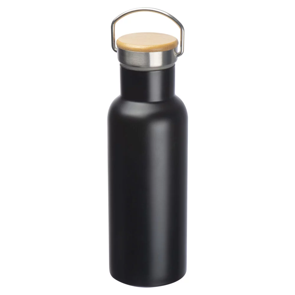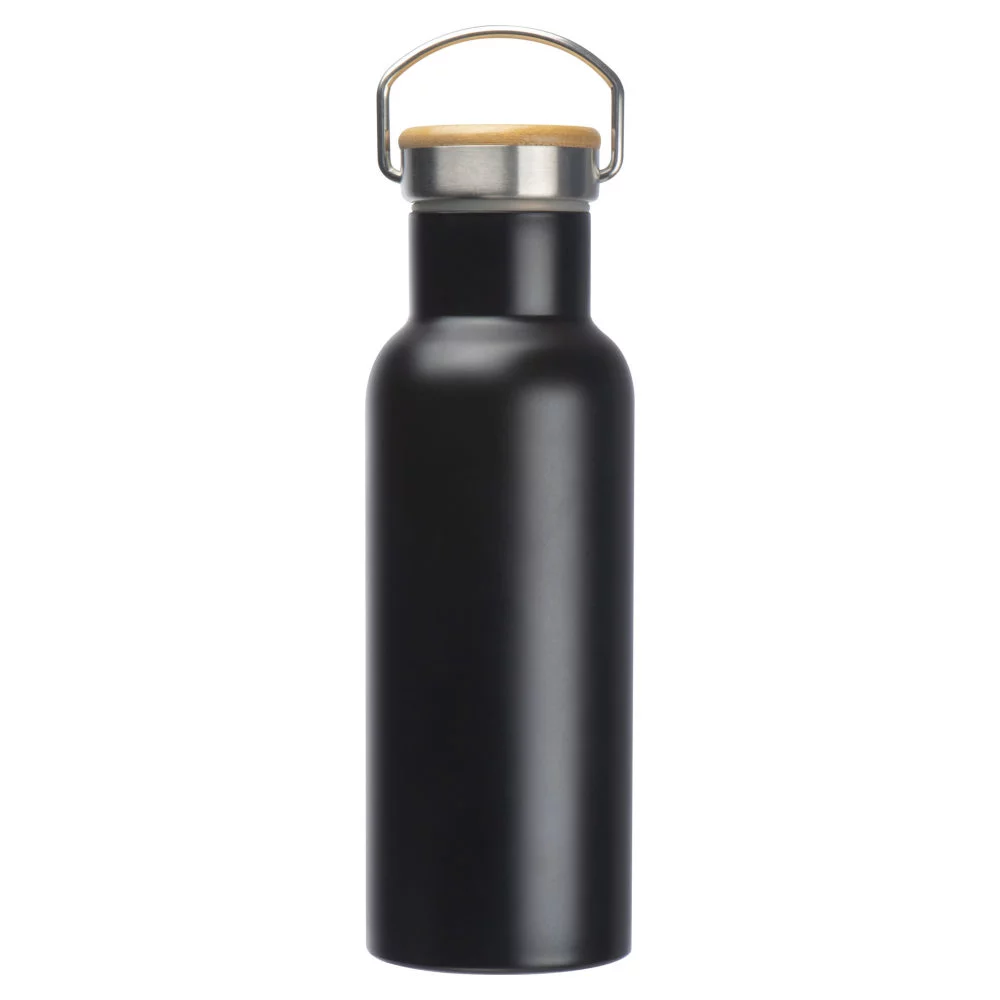 Die doppelwandige Edelstahlkonstruktion sorgt dafür, dass heiße Getränke lange warm und kalte Getränke über Stunden angenehm kühl bleiben. Durch den auslaufsicheren Bambusdeckel mit integriertem Metallhenkel lässt sich die Flasche bequem transportieren und sicher verschließen. Die matte schwarze Oberfläche verleiht der Flasche eine schlichte Optik und bietet gleichzeitig eine ideale Fläche für eine dauerhafte Gravur mit klaren Konturen.